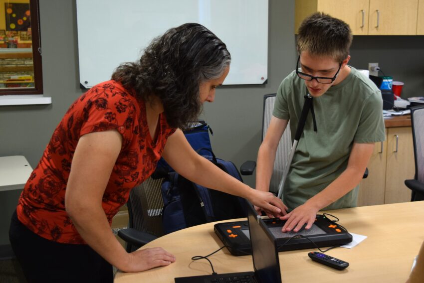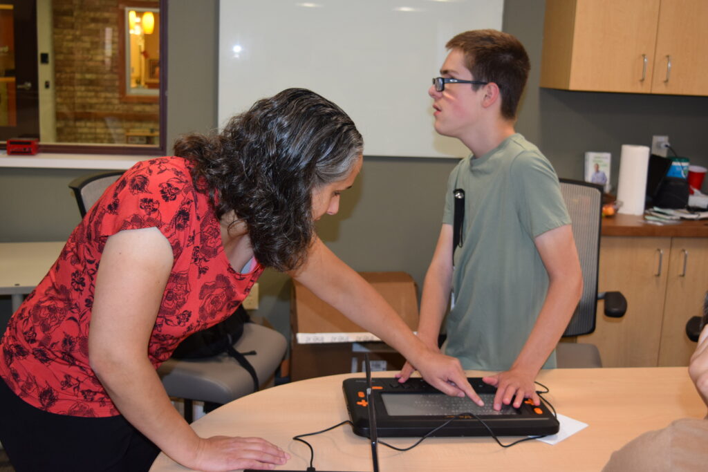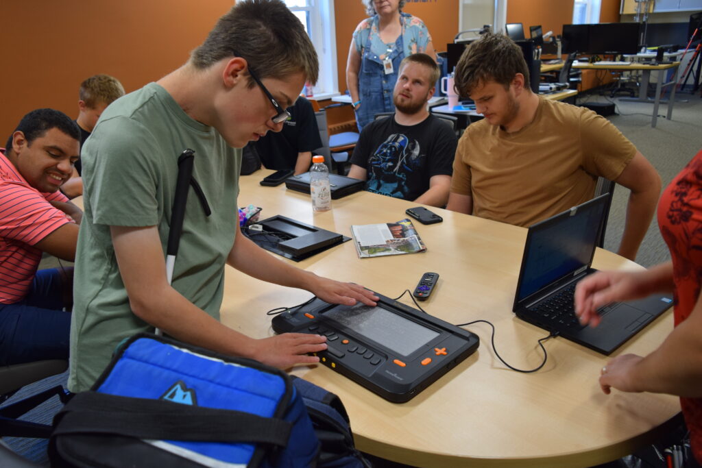 Today our young adults were introduced to the hands-on Monarch Braille Display! Rachel Ramos of HumanWare came and allowed participants to test drive this remarkable piece of adaptive technology with a tactile digital map of the USA displayed. The second part of the day was an exploration of the Meta glasses, Envision glasses, and SeeingAI and Be My Eyes apps. Thanks to all who signed up and our presenters for making this such an informative couple of days packed with all of the technology they could handle.